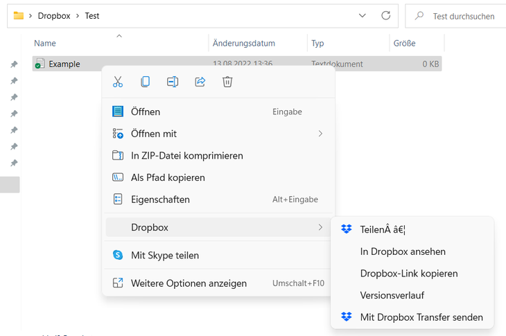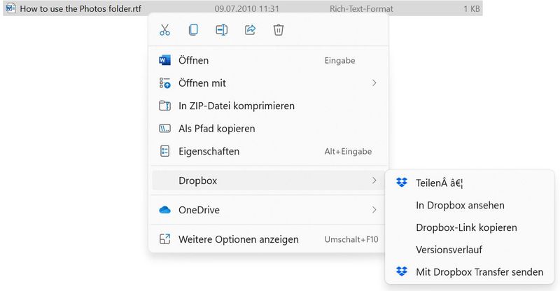 Example of the current problem with the Dropbox context menu entry in Windows 11