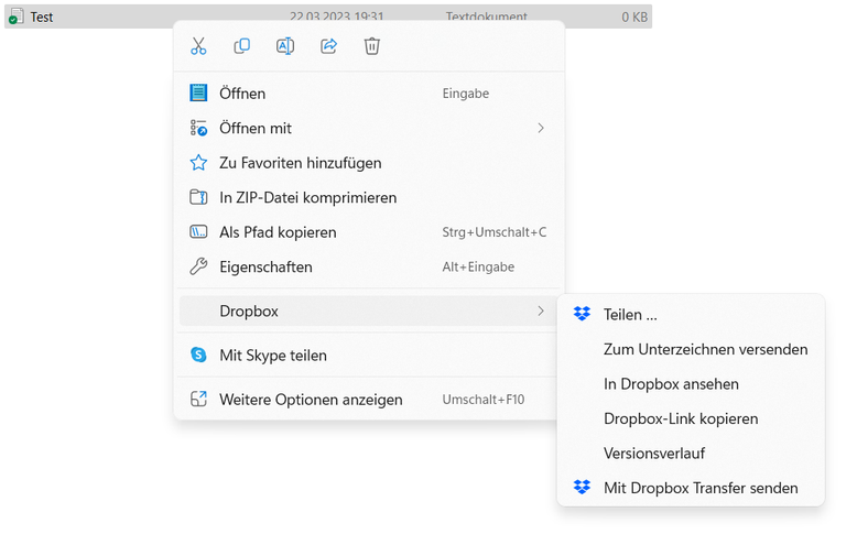 Beim Rechts-Click auf eine Dropbox Datei erscheint das Dropbox Kontext Menu.