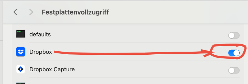 Datenschutz& Sicherheit → Festplattenvollzugriff → bei Dropbox aktiviert sein