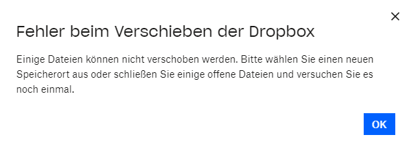 Stellen Sie bitte sicher, dass keine Dropbox-Dateien geöffnet sind, bevor Sie versuchen, den Speicherort des Ordners zu verschieben.