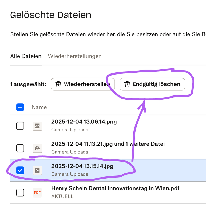 Wenn Sie die Datei entgültig löschen wollen, gehen Sie zu den "gelöschten Dateien"