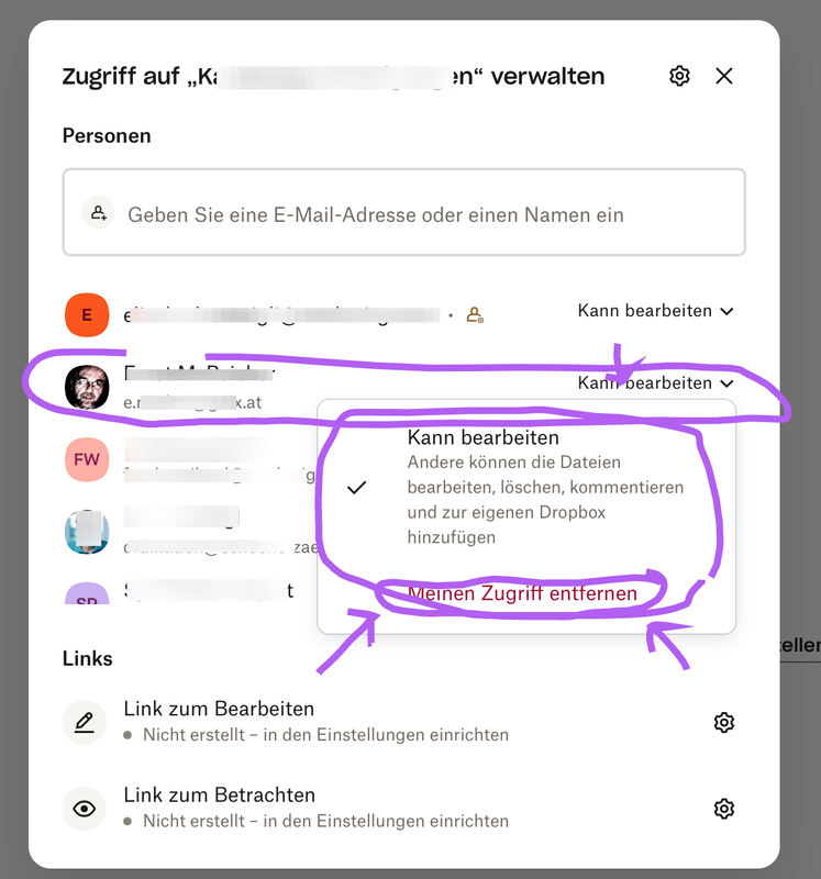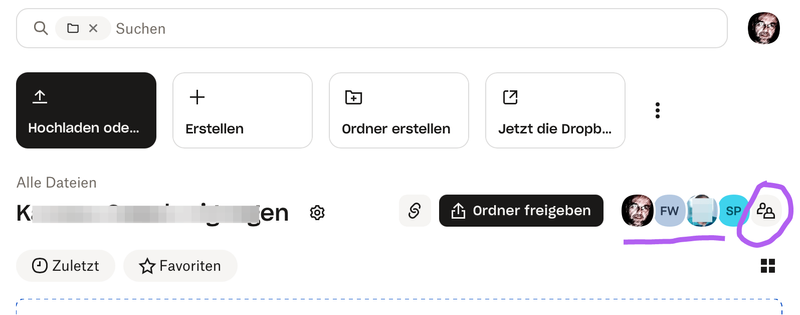 der violette Strich zeigt alle, die an diesem Ordner teilhaben und violett eingeringelt ist der Konfigurationsbutton.