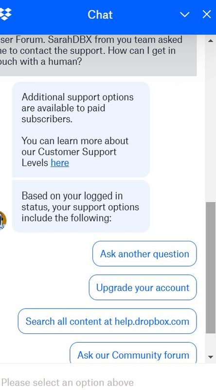 Leider weiss ich nicht, auf welchem Weg ich auf der von Ihnen angegeben Support-Seite jemanden von Ihnen in meinem Fall direkt erreichen kann, damit Sie von Dropbox das Backup-Abo für mich kündigen können. Der Chatbot sagt mir folgendes (siehe Bild).