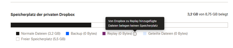 In Dropbox Replay war ein einziges Foto, das ich zu Testzwecken dort geladen hatte, Volumen ca. 10MB. In den Infos zu Replay steht, dass Medien in Replay keinen zusätzlichen Speicherplatz belegen.