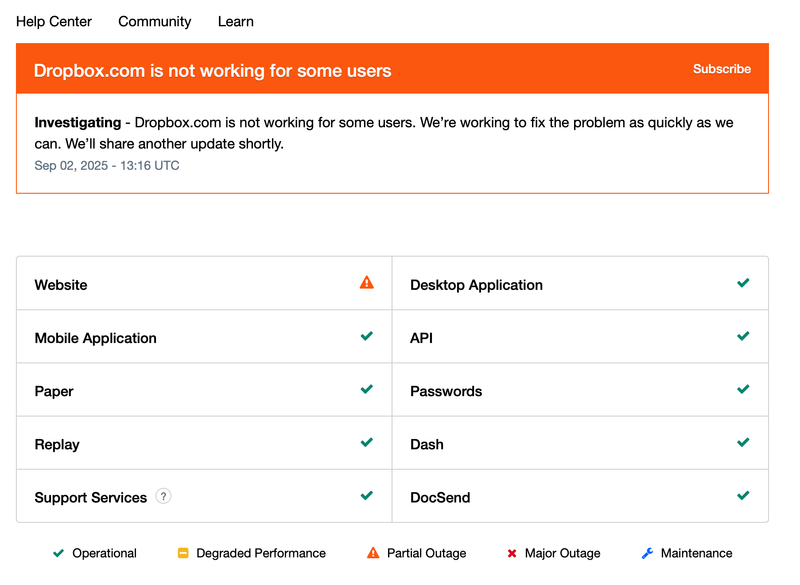 Es gab vorübergehend ein Problem mit der Dropbox-Website, aber das Problem ist nun behoben und alles sollte ordnungsgemäß funktionieren.