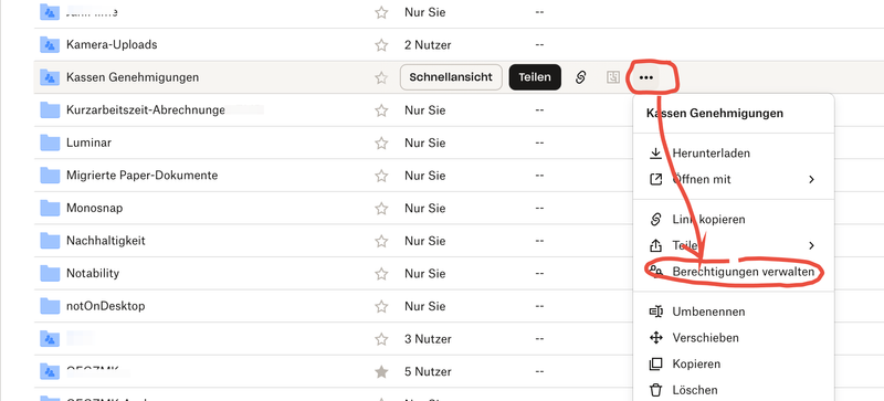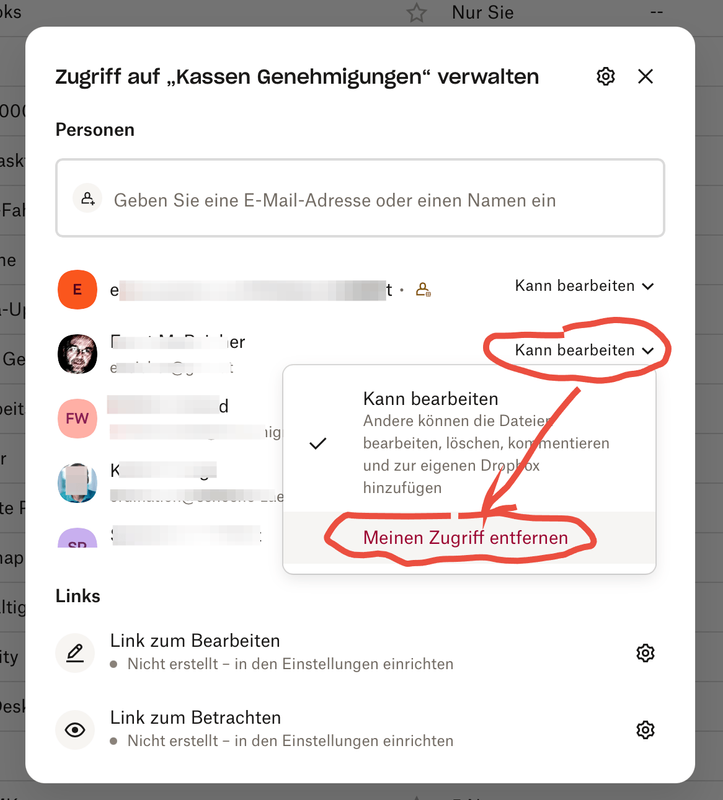 Im darauf erscheinenden PopUp-Fenster sehen Sie alle, die an diesem geteilten Ordner teilhaben. Einer ist der "Eigentümer" - vermutlich nicht Sie - alle anderen können entweder nur "betrachten" oder haben die Berechtigung "Kann bearbeiten" - dort können Sie Ihren "Zugriff entfernen" - voila…
