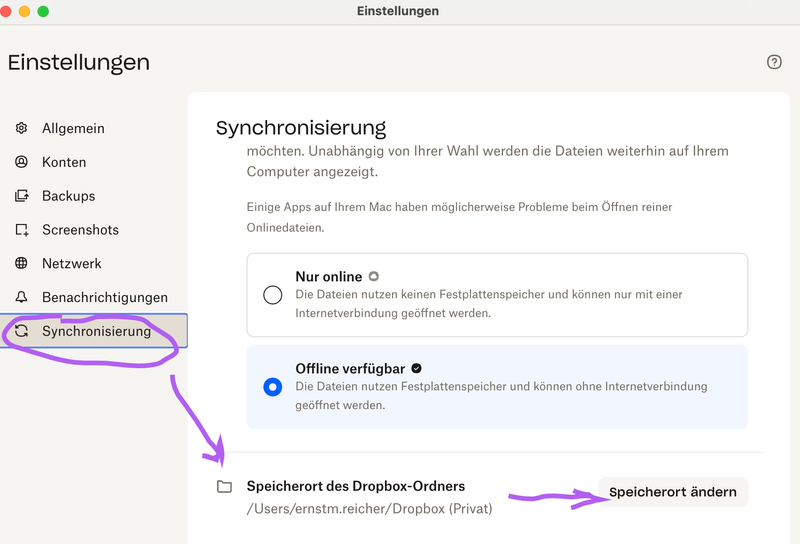 - mit einem Synchronisationsprogramm die Offline Dateien vom PC mit denen auf der Dropbox Cloud synchronisieren. Also mein schon beschriebener Ordner "Meine Dateien"!