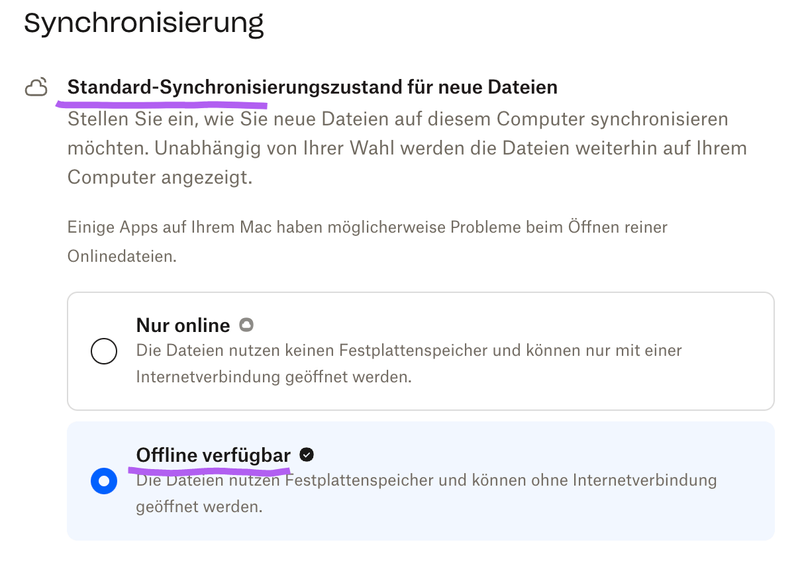 Ihre Daten bleiben auf Ihrem Computer! Nur wenn Sie das zusätzliche Feature "nur online" aktivieren würden (siehe screenshot unten), würden die Dateien gleich nur online gespeichert - das ist dann sinnvoll wenn Sie auf Ihrem Rechner zu wenig Speicherplatz haben…