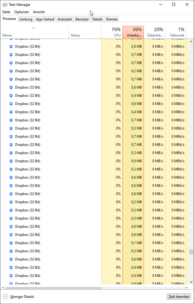 ich muss jetzt hier mal fragen, da ich meinen PS nicht mehr nutzen kann. Seid heute habe ich das Problem, dass die Dropbox hunderte Prozesse verursacht. Teilweise ist die CPU-Last auch auf 100%