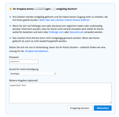 Ich möchte mein Dropbox-Konto endgültig löschen und habe soeben bei Einstellungen unter ALLGEMEIN die Funktion Konto löschen angeklickt. Danach öffnete sich ein Fenster, wo das Passwort abgefragt wird, das ich dort auch korrekt eingetragen habe.