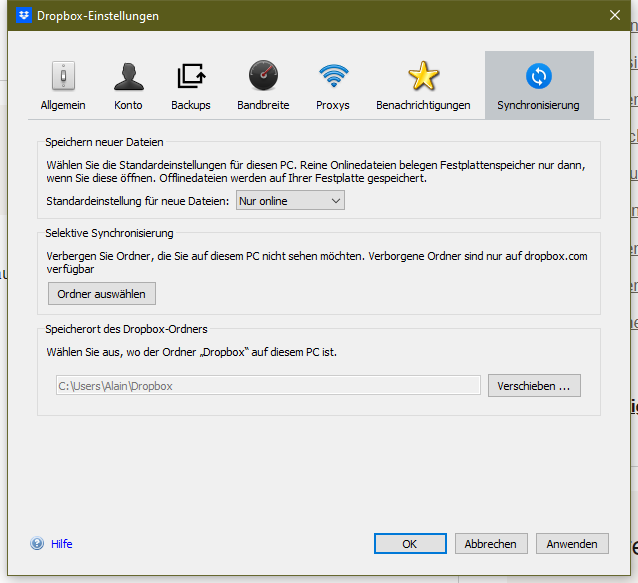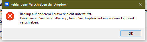 Hallo. Ich habe mein DB-Konto auf 2 TB geupgradet. Der Dropbox-Ordner auf meinem PC ist unter der Partition C, wo nicht genügend Speicherplatz ist. Nun möchte ich den DB-Ordner in eine andere Partition verschieben, was aber nicht geht und mir eine Nachricht sagt, "Backup auf anderem Laufwerk nicht unterstützt. Deaktivieren sie das PC-Backup, bevor sie Dropbox auf ein anderes Laufwerk verschieben". Unter Google wird erklärt, ich soll in den Einstellungen bei DB, die automatische Sync abstellen. Diese Funktion, wie in Google bildlich dargestellt, wird bei mir unter Einstellungen nicht angezeigt. Ebenfalls wird bei BackUp die Funktion nicht angezeigt, den WLan ausschalten zu können ???