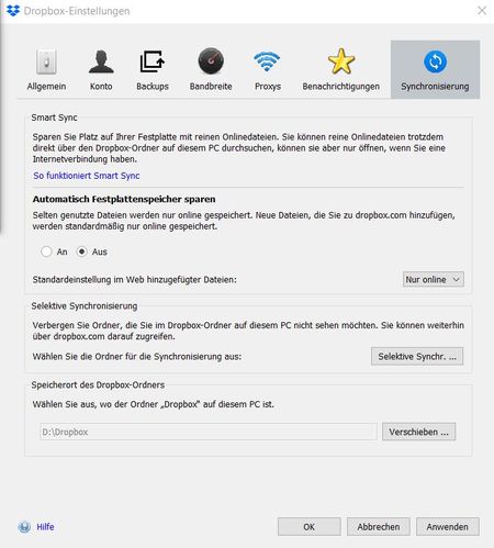 Es sollte auch möglich sein, ohne vorherige Löschung des Ordners auf D:\ den Dropbox-Ordner von C:\ dorthin zurĂŒckzuverschieben; in diesem Fall können Sie den alten Speicherort beim Verschiebevorgang angeben.