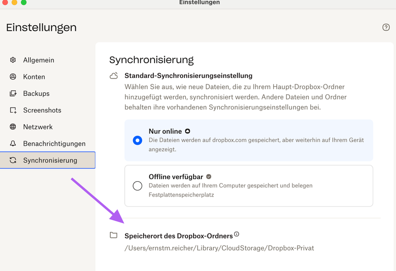 Daher wollte ich den künftigen Speicherort für die Dropbox auf das große Laufwerk F verschieben.