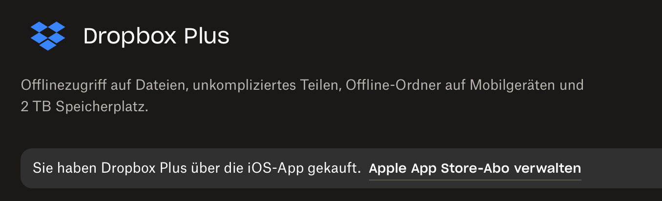 da ich meine Dropbox mittlerweile überwiegend geschäftlich nutze, möchte ich die Abo-Zahlung zukünftig nicht mehr über die iOS App abwickeln, sondern direkt über die Website. Ich möchte in meinem privaten Apple-Account keine zusätzliche Zahlungsmethode für ein separates (gewerbliches) Konto hinzufügen.