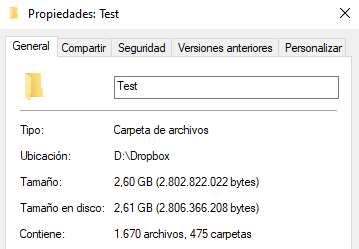 Ahora que me fijo, añado algo importante que me había dejado, al final, en la copia realizada, se han copiado correctamente el número el ficheros que debe ser y con el tamaño de carpeta correcto. El caso es que de entrada parece que en el calculo a la hora de procesar la copia fuera todo al doble. Adjunto captura con las propiedades de la copia resultante en otra carpeta fuera de Dropbox. Si ahora esta carpeta fuera la que se copia hacia otro destino, entonces con esta carpeta, el calculo inicial de tamaño si que es el correcto.
