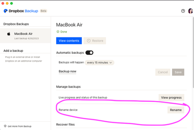 Hola, vumir:Puedes cambiar el nombre de las copias de seguridad accediendo a la copia desde las preferencias de la aplicación de escritorio y si estás usando versión beta de Dropbox Backup. Ten en cuenta que al estar en pruebas esta característica está disponible únicamente para un grupo de usuarios limitado en este momento.¡Espero que esta información te sea de utilidad! - vumir7 months agoCollaborator | Level 9