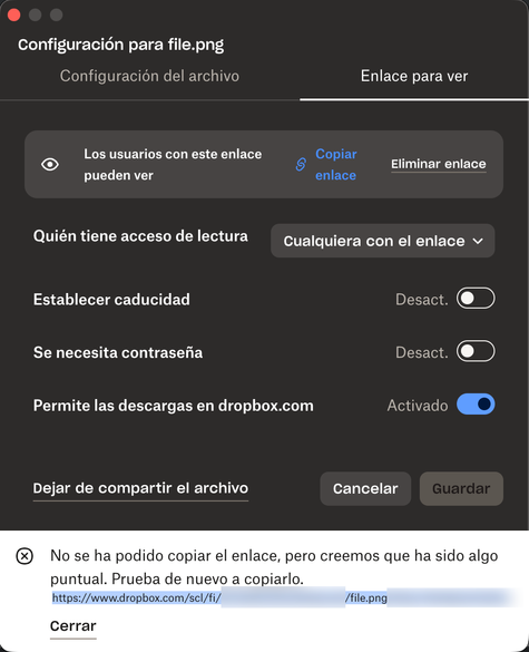 Por otro lado, en ocasiones Dropbox interrumpe la actividad compartida y establece limitaciones a la creación de enlaces. Puedes revisar más información en el siguiente artículo.