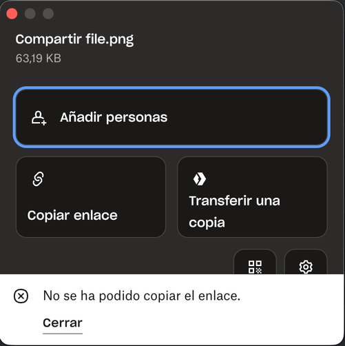 desde hace unos días está habiendo cambios en el "widget" de compartir archivos con una nueva UI donde ya no es necesario crear el link y se puede copiar directamente. Pero la opción de copiar ha dejado de funcionar de un día para otro.