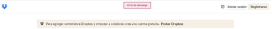 Hola, Niko12:¡Bienvenida a la Comunidad de Dropbox!Ten en cuenta que hay un limite de descarga de contenido desde la página web. Si el archivo o grupo de archivos son de menos de 20GB y te da error, ¿has probado desde otro navegador a ver si te sucede lo mismo? Por otro lado, estoy viendo que en la captura de pantalla no tienes iniciada sesión con una cuenta de Dropbox, ¿de donde estás descargando el contenido?Quedo a la espera de tu respuesta.