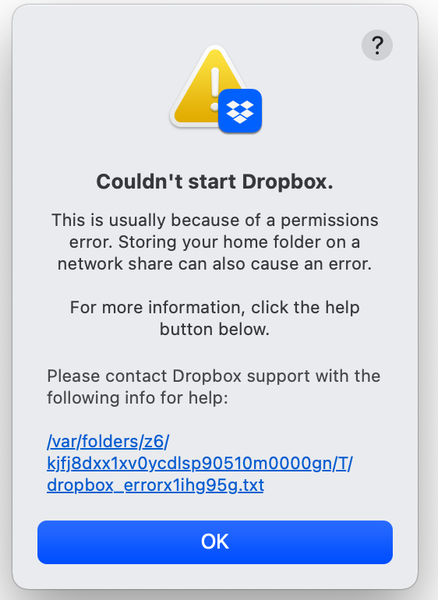 en el mac de escritorio no me actualiza los archivos del dropbox. Me dice que no se puede iniciar el dropbox por un error en los permisos. Adjunto la imagen y el texto que me sale: