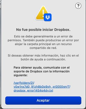 Hola, al instalar IOS Monterrey en mi computador se cayó Dropbox y ahora no puedo acceder, ya que me aparece el siguiente mensaje: Si entro a los logs me aparece lo siguiente : ...