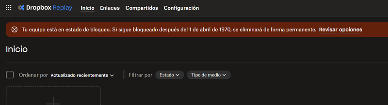 Hoy he accedido a la aplicación Dropbox Replay y me aparece una barra roja con el siguiente mensaje: "Tu equipo está en estado de bloqueo. Si sigue bloqueado después del 1 de abril de 1970, se eliminará de forma permanente. Revisar opciones".