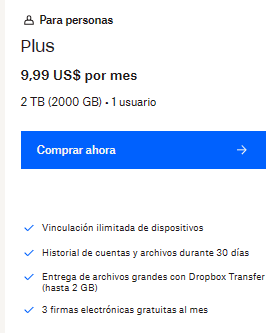 Por favor su apoyo, tengo que comprar unas cuentas de dropbox, es para compartir archivos. A que se refiere "2TB - 1 usuario" del plan "Plus", que beneficios tengo y si lo puedo usar en una empresa ...