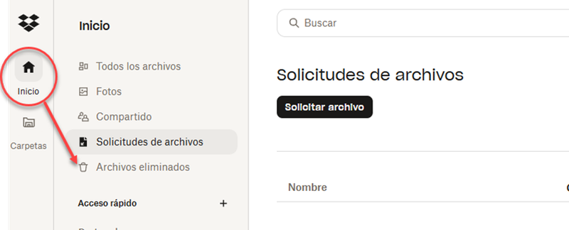 La sesión de archivos eliminados está solo al entrar en tu página de Dropbox en el lateral izquierdo.