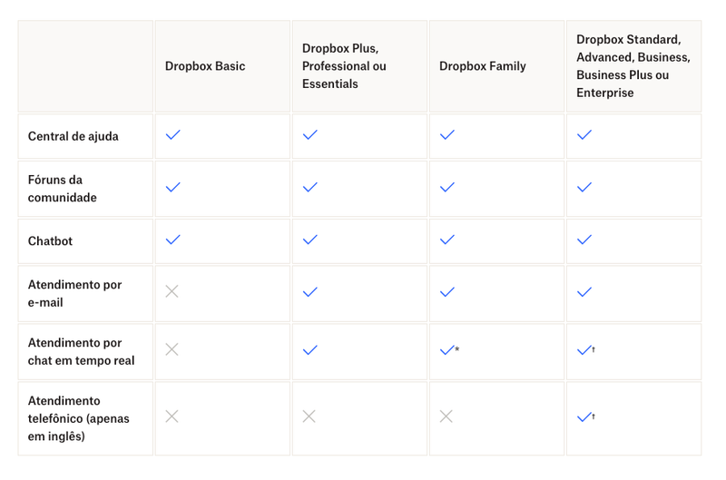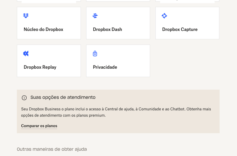 Esse link de suporte não funciona, eu tenho o plano Family e o Business e todas as opção de suporte ficam desabilitadas pra mim, e continuo tendo problemas na minha conta com espaço limitado a 2TB sendo que o plano business é para 9TB, e simplesmente não consigo contato com suporte pra resolver, é triste o descaso do DropBox com seus clientes 🤨.