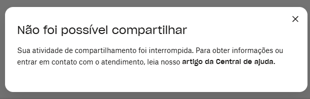 "Não foi possível compartilhar. Sua atividade de compartilhamento foi interrompida. Para obter informações ou entrar em contato com o atendimento, leia nosso artigo da central de ajuda."