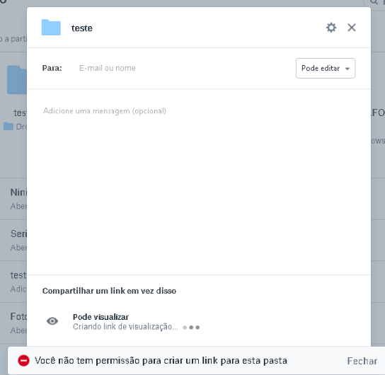 Boa noite, já faz um tempo que não consigo gerar LINK de qualquer pasta ou arquivo no meu dropbox, sempre que clico em CRIAR LINK aparece a mensagem a baixo: