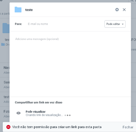 Boa noite, já faz um tempo que não consigo gerar LINK de qualquer pasta ou arquivo no meu dropbox, sempre que clico em CRIAR LINK aparece a mensagem a baixo: "você não tem permissão para criar um ...