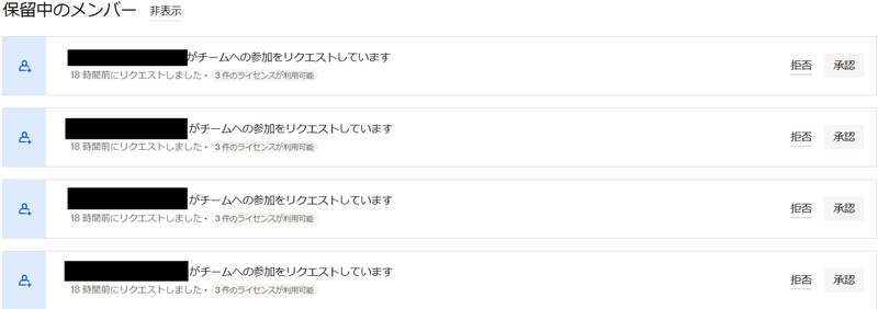 表示されるユーザー方々がお客様のチームへ参加希望とリクエストをしている