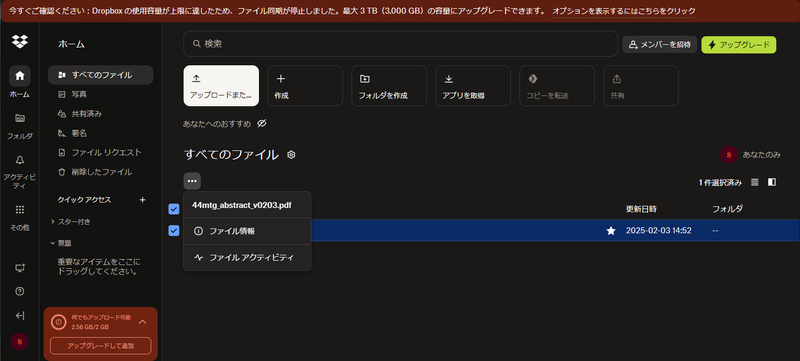 ウェブから操作していますが、ファイル横の"..."をクリックしても、「ファイル情報」「ファイルアクティビティ」のメニューしか出ず、「共有済み」やDropbox Transferのところにも、該当ファイルが表示されておらず、どうすればアカウントから削除されるかわかりません。