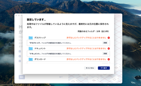 再度ログアウトしログインした際に「macのバックアップが必要な場合」のチェックを全てつけログインしようとすると画像のような表示が出て全く進みません。