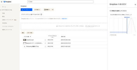 Dropbox Plusプラン契約中で、巻き戻しという機能を見つけたので、使ってみようとするものの、