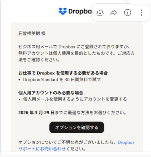 取引先と資料のやり取りのためにDropboxの無料プラン(Basic)を使用しており、Dropboxは取引先が設定してくれて、当社は無料で利用しています。今回、仕事で使用しているのであれば無料版は使用できないという連絡が来たと部下から報告があったのですが、Dropboxの公式サイトや規約を確認しても、仕事で使用しているのであれば無料版は使用できない記載が見当たらなく、どのような理由で有料版に切り替えなければならないのか教えて頂けますでしょうか?なお、有料版に切り替える場合、1アカウント1,500円/月、と聞いています。