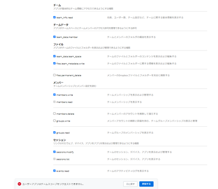 DropBoxAPIを使用するための、コンソールアプリ作成のUIが変更されており。 チームアプリが作成できませんが、正しい手順などはありますか。 手順(以下、管理者アカウントで操作) 1.APIを選択します ⇒スコープアクセス 2.必要なアクセスのタイプを選択します ⇒ フルDropbox –ユーザーのDropbox内のすべてのファイルとフォルダーへのアクセス。 3.アプリ...