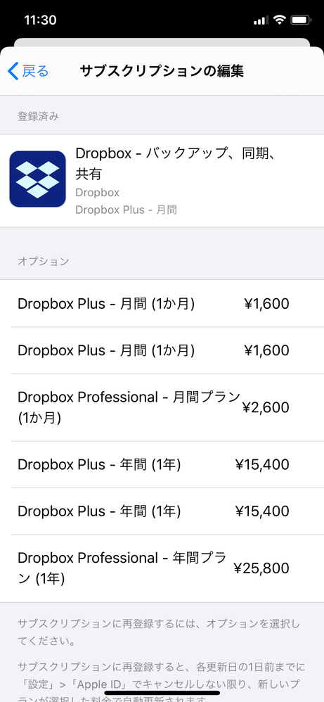 アプリが最新の状態になっていない場合、[購入内容を復元する]オプションは表示されません。ご利用のデバイスで App Store から Dropbox アプリをアップデートしてもう一度お試しください。