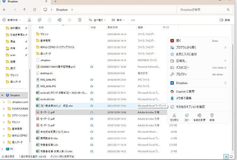 今のスクリーンショットで雲アイコンのファイルを道クリックした際に「Dropbox」をクリックし「オフラインアクセス可」があるか確認いただけますでしょうか?