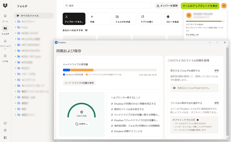 PCの特定フォルダ(570G)を同期した状態でDropboxの容量が2.7Tになる