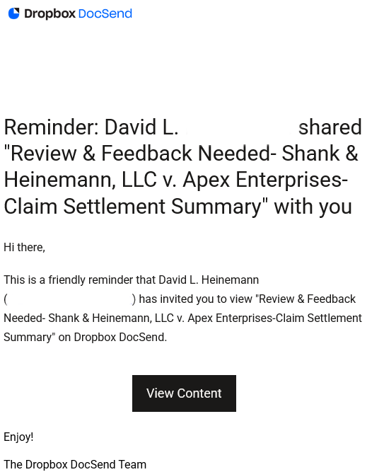 It is now 5 days later and "The Dropbox DocSend Team" sent a reminder email out.