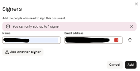 I'm trying to send a document for signature, but when I click on 'Add another signer', it won't allow me to add one.