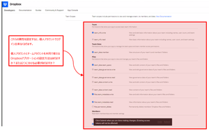 A,B,Cと3つのシステムにてAPIを通したファイル共有を検討中です。 以下のようなフォルダ構成で、それぞれ3システムのアクセス権を制御したいのですが、うまくいかず投稿させていただきました。 /<アカウントの名前> ├ Bフォルダ ・・・ AとBシステムが読書き可能 └ Cフォルダ ・・・ AとCシステムが読書き可能 BフォルダのリンクをBシステムに、CフォルダのリンクをCシステムに通知して、APIでアクセスしてもらおうと考えております。 (Aシステムはアカウント本人として考えています。) そもそも、この考えが間違っている、あるいは、より良い方法がありましたら、ご指摘、ご教授いただければ幸いです。 以下、上記の考えを元に、試した状況です。 1.アプリを作成し、アクセストークンを取得 2.Aシステムから、APIでファイルをアップロード 3./アプリ/<アプリ名>/Bフォルダ 配下にファイルが作成された 3.で想定と異なり、今に至ります。 APIで、/<アカウントの名前>/Bフォルダ 配下にアップロードはできないのでしょうか? Businesプランで、チームフォルダを利用しないといけないような気がしています。 よろしくお願いいたします。Solved395Views0likes5CommentsDropboxアプリケーションにTeam関連スコープを設定してあると個人アカウントでログイン出来ない