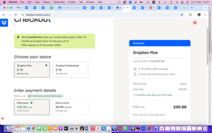 I am using a macbook pro (OS Monterey - 12.7.5 I am looking into upgrading my from my free acount to dropbox plus. Dropbox offers 3 months free off the monthly subsciption (£7.99) when paid annually. However the amount to be paid is £95.88 (= 12 x £7.99). How can I redeem the offer? My account has been suspended for generating too much traffic so I need to resolve this quickly.39Views0likes2CommentsI wonder if I have more than one account?