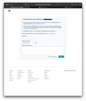 All I want to do is delete my account, but it won't let me - I logged in using google, so I don't have a password. The help document said there is supposed to be a button that says "Send Mail", but guess what - it doesn't exist. I used to like dropbox and would recommend it, but making it this hard to delete an account is insanity, hence the username on this support forum I had to create just to get this stupid problem solved. Why? you can't call support, you can't e-mail support, and the support docs don't handle when the coding was screwed up from the git go. All I want is out!105Views0likes2CommentsI deleted one of my accounts and it's still active