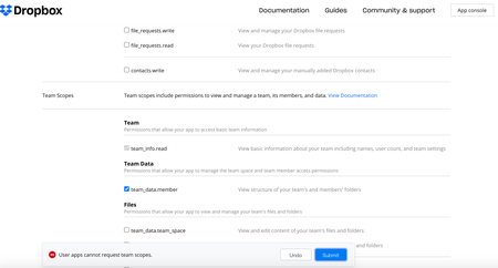I want to integrate my app to Dropbox. I want my app to access client's dropbox account and upload and download files, and so on. My clients are possibly personal and team both. So I made My app on Dropbox app console, and tried to attach permission to team(business account) access, but I could not and Error message show "User apps cannot request team scopes." . I cannot understand "User apps" means... How can I solve it?SolvedFile Requests API (or Zapier Integration)?