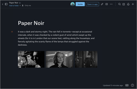 Overview Dark mode has been one of Paper’s most requested features from our users. We are now very happy to say that dark mode for Paper is now available! Audience This feature is available to all Dropbox Paper users, including our Basic, Pro and Plus subscriptions, not just those on a team subscription. How do I get it If you haven’t seen dark mode yet, you can flip it on from the “?” menu on the bottom-right of any Paper doc. You can also turn on dark mode from your computer’s system preferences. This is available on desktop, so get on there and start using it now! More ideas If you have more ideas on how we can improve our product then check out our Paper ideation board here, or our Dropbox Business ideation board here. Request improvements, suggest ideas, we’ll review them all! Thank you for helping to improve our product.56KViews6likes2Comments