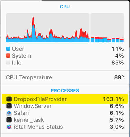 I'm using the latest version of Dropbox (v186.4.2607) on my MacBook Pro (2,4 GHz 8-Core Intel Core i9) that is running macOS Sonoma 14.1. Lately I've noticed that Dropbox is having a high cpu (150 - 200%) almost all of the time. Dropbox is always syncing although nothing is synced because all is already synced. The menubar icon always shows the sync icon and never the ready icon anymore. This is very unpleasant and the MacBook Pro is now always very warm/hot with temperatures from 85 to 100 ºC and that is not how it should be. Is there a solution for this issue?14KViews4likes27Comments'Search by tag' not working