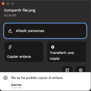 Hola, desde hace unos días está habiendo cambios en el "widget" de compartir archivos con una nueva UI donde ya no es necesario crear el link y se puede copiar directamente. Pero la opción de copiar ha dejado de funcionar de un día para otro. Además el error se produce tanto en MacOs como en Windows. Adjunto captura. Por mucho que lo intentes, nunca funciona. La única solución que he encontrado es: - Entrar en la configuración de link (icono abajo a la derecha). - Ir a la pestaña "Enlace para ver". - Hacer click en la opcón "Copiar enlace" azul. - Copiar el enlace manualmente desde el error en la parte inferior. ¿Alguna idea?21Views0likes3CommentsNo puedo compartir
